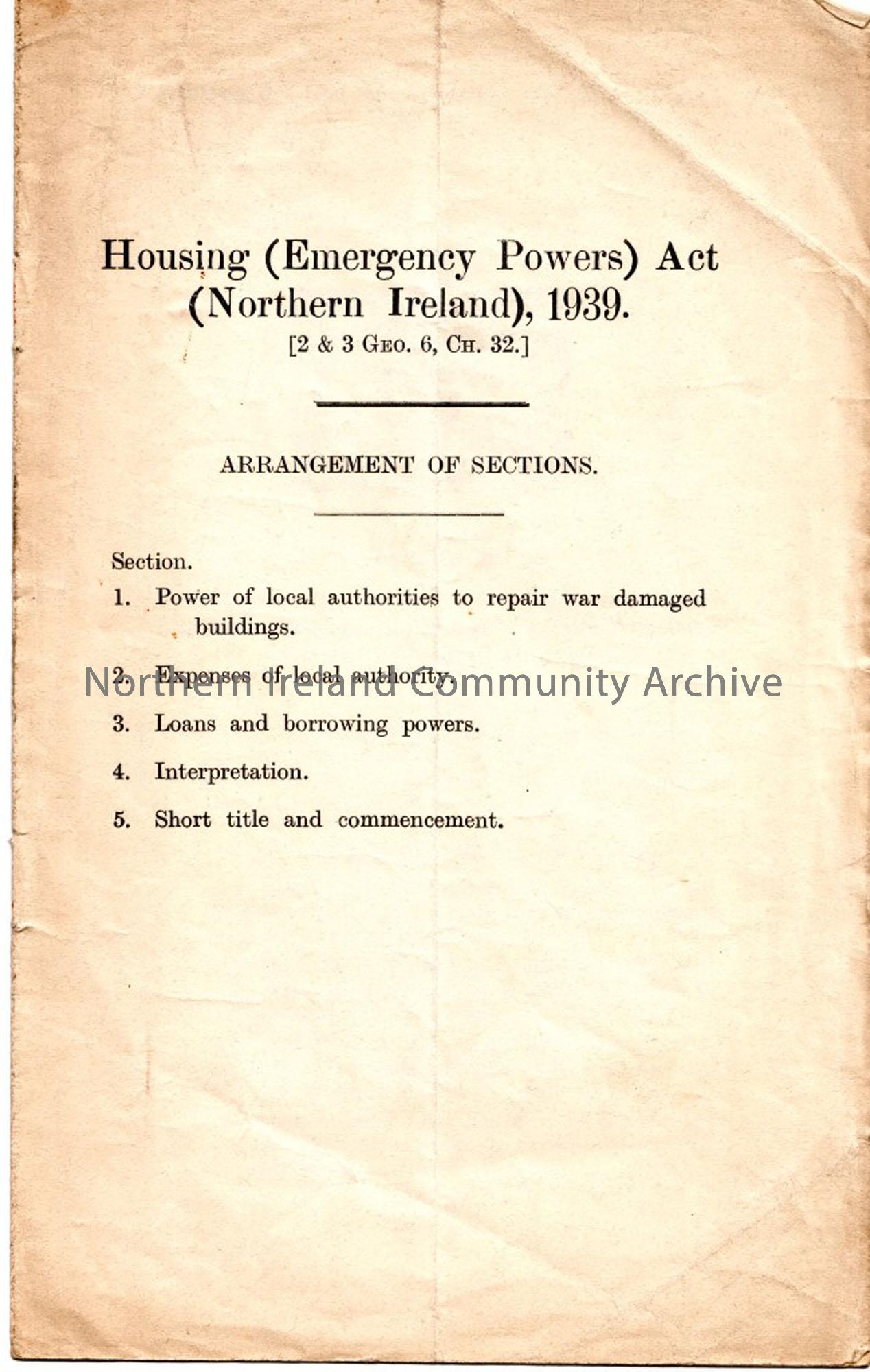 Planning and Housing Act (Northern Ireland) 1931, Housing (Emergency Powers) Act (Northern Ireland) 1939 and Compensation (Defecnce) Act 1939.