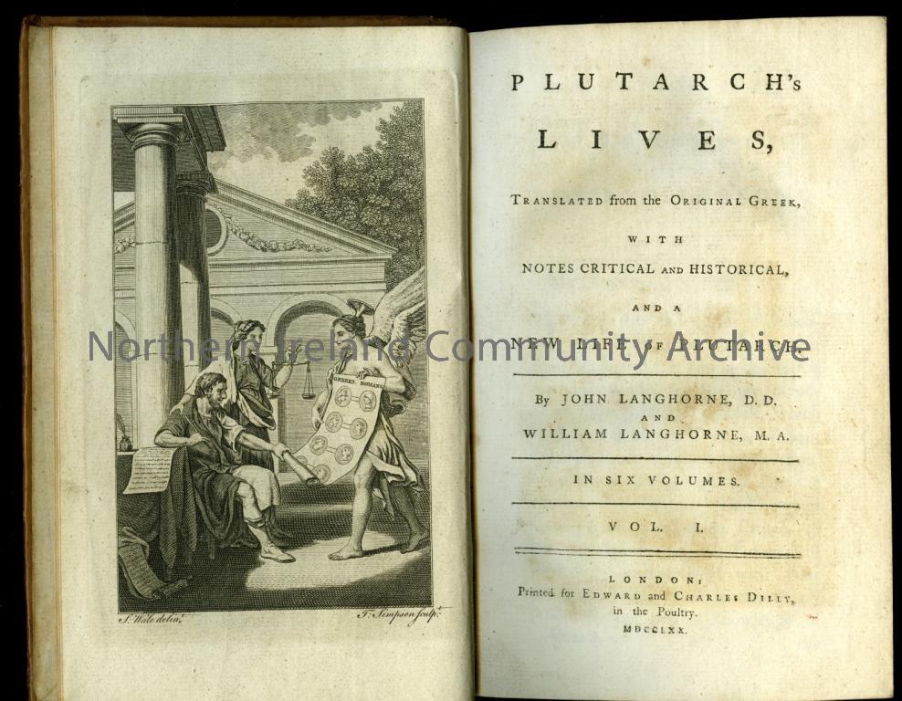 Plutarch’s Lives Translated from the original reek with notes critical and historical and a New Life of Plutarch. By John Langhorne, D.D and Willim Langhorne, M.A. In Six volumes Vol I. Printed for Edward and Charles Dilly, in the Poultry. London. Contain (2672)