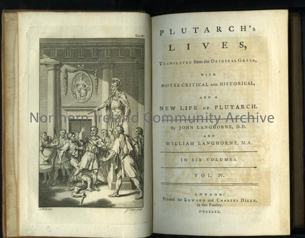 Plutarch's Lives Translated from the original reek with notes critical and historical and a New Life of Plutarch. By John Langhorne, D.D and Willim Langhorne, M.A. In Six volumes Vol IV. Printed for Edward and Charles Dilly, in the Poultry. London. Contai