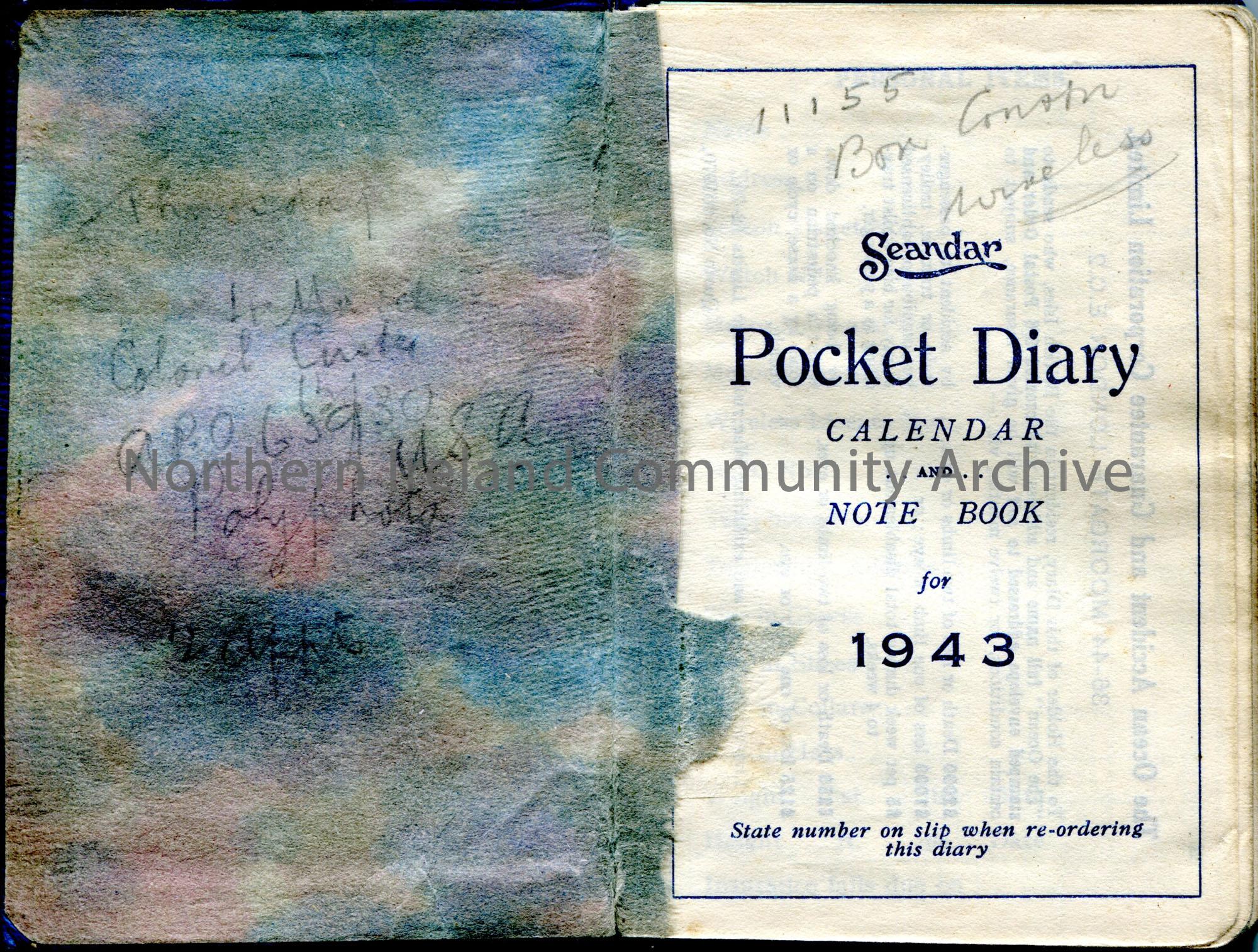 Pocket diary. Blue cover. Dated 1943. Belonged to Sam Henry. Most days are filled in. Pages missing towards back for dates 16-29 December.