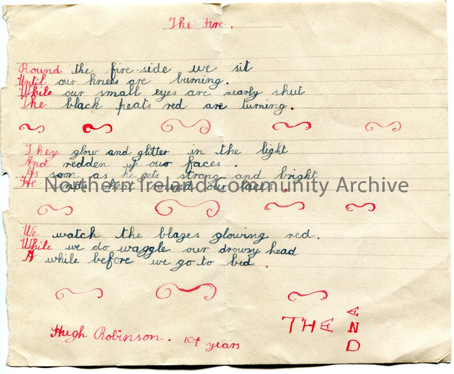 Handwritten poem by Hugh Robinson aged 10 1/2. Titled, 'The Fire'. 3 verse poem re the heat when sitting by the fire. Hugh was a pupil at Tullygrawley P.E.S.