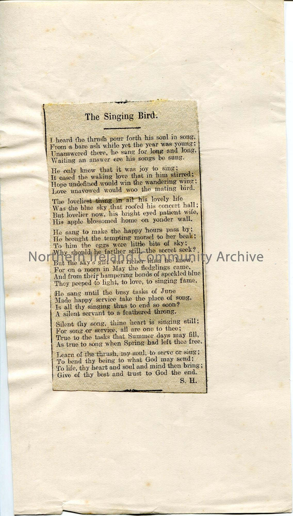 Poem cut from a newspaper and pasted to paper. Titled, ‘The Singing Bird’. By Sam Henry. Re the Thrush. Handwritten names in pencil on reverse of page…