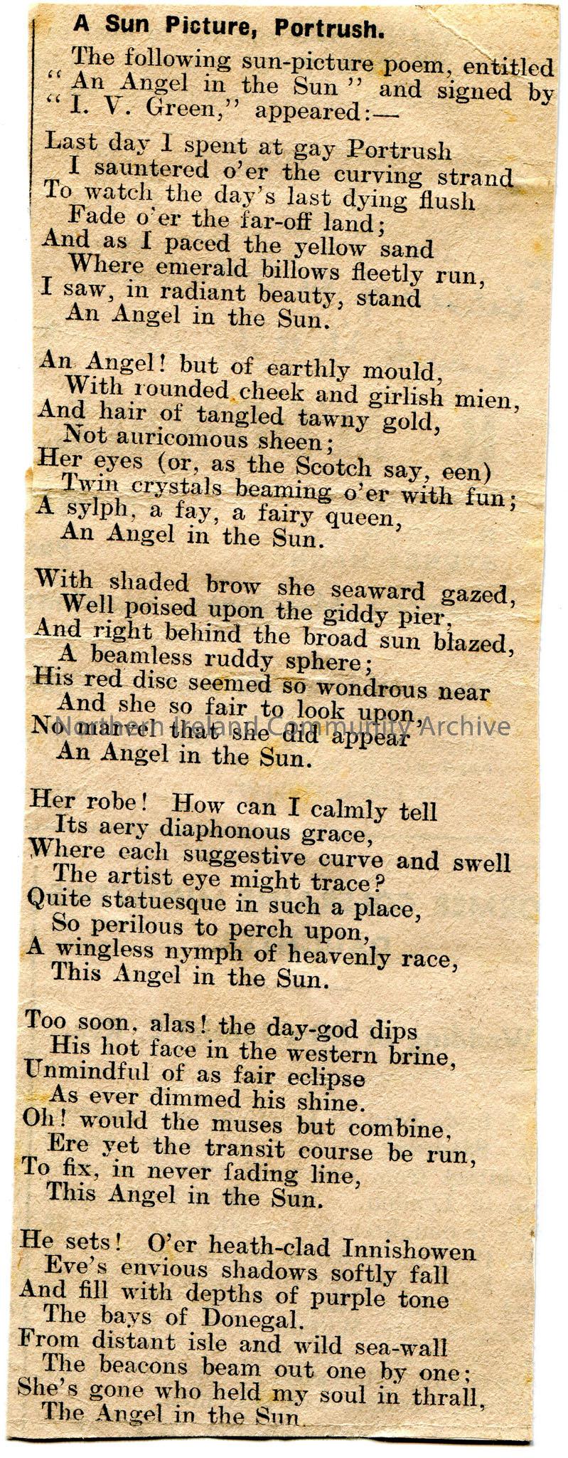 Poem cut from a newspaper and stuck to paper. The article is titled, ‘A Sun Picture, Portrush’ and the poem is titled, ‘An Angel in the Sun’. It notes…