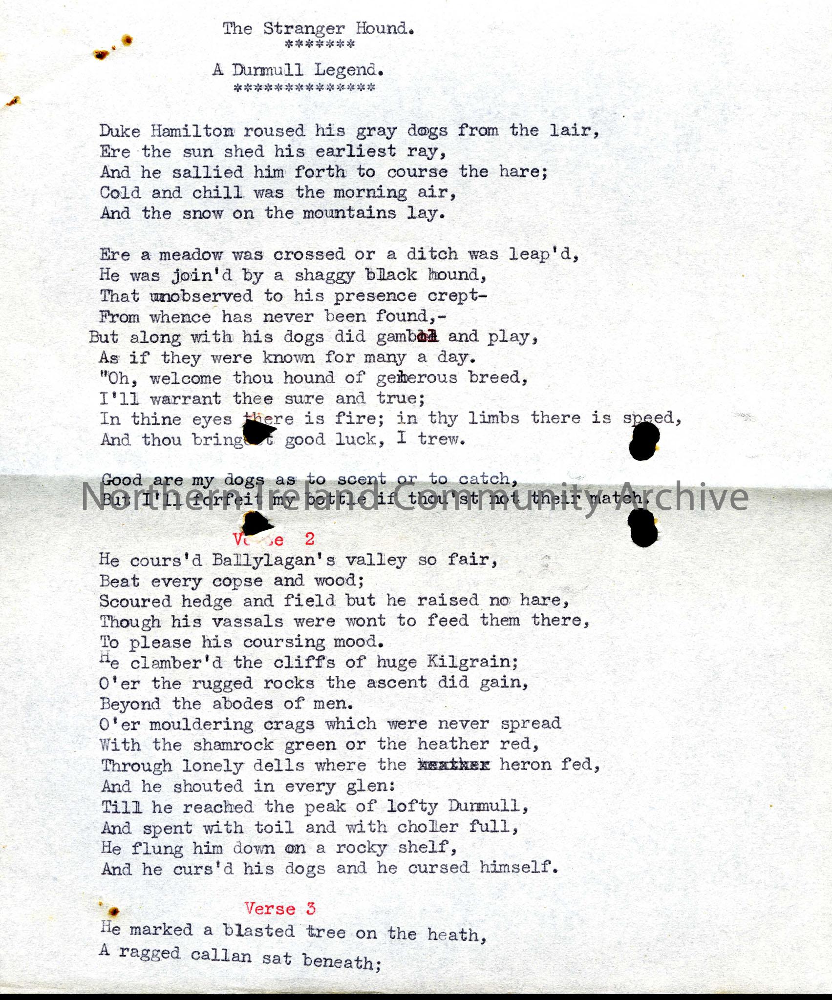 Poem entitled “The Stranger Hound” and sub-titled “A Dunmull Legend”.It was written anonymously about 1806 and the Duke Hamilton mentioned was a membe…