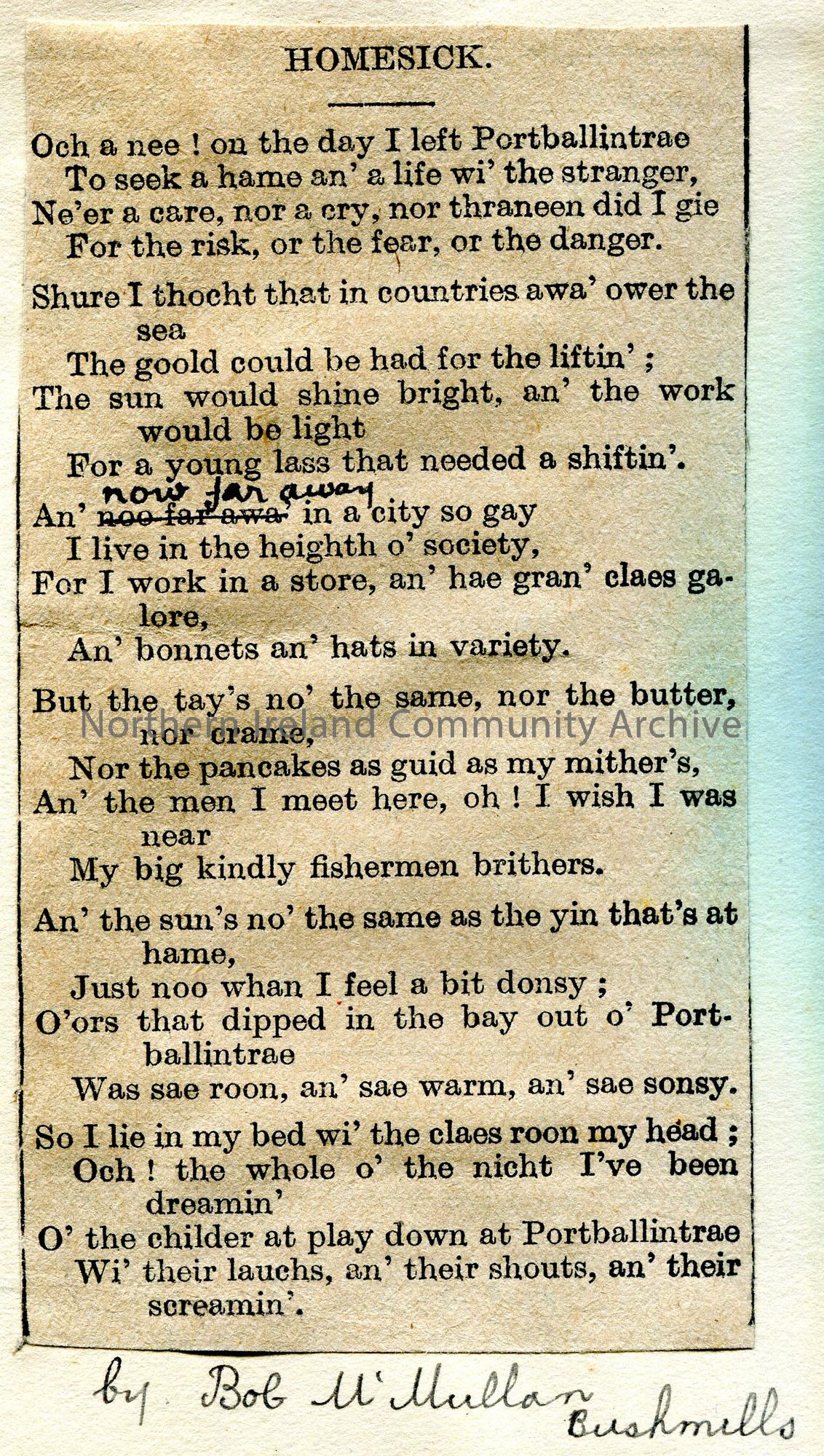 Poem or words to song cut from a newspaper. Titled, 'Homesick'. By Bob McMullan, Bushmills. Author has made a correction in handwriting. Spoken in local dialect. Re Portballintrae.