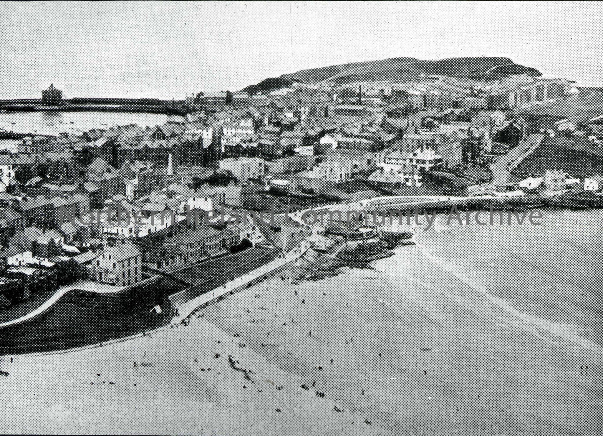 Aerial view of Portrush town, from Arcadia towards harbour