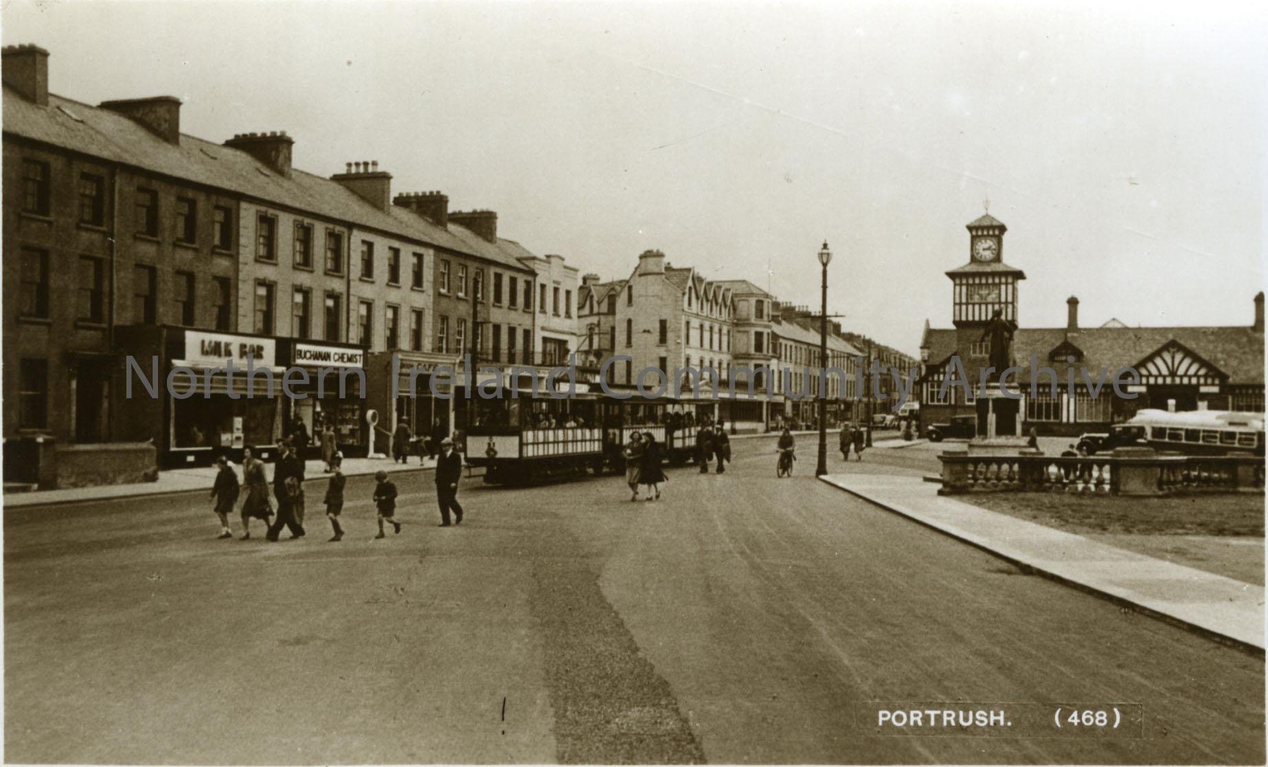 postcard titled, 'Portrush' depicting people, tram, and shops. Main street where Barry's is located