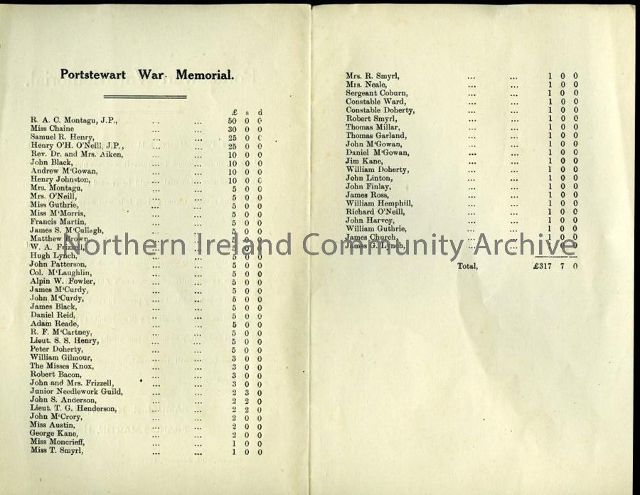 Portstewart War Memorial Fund book, page 1, outlining the subscriptions offered towards the cost of erecting the monument.