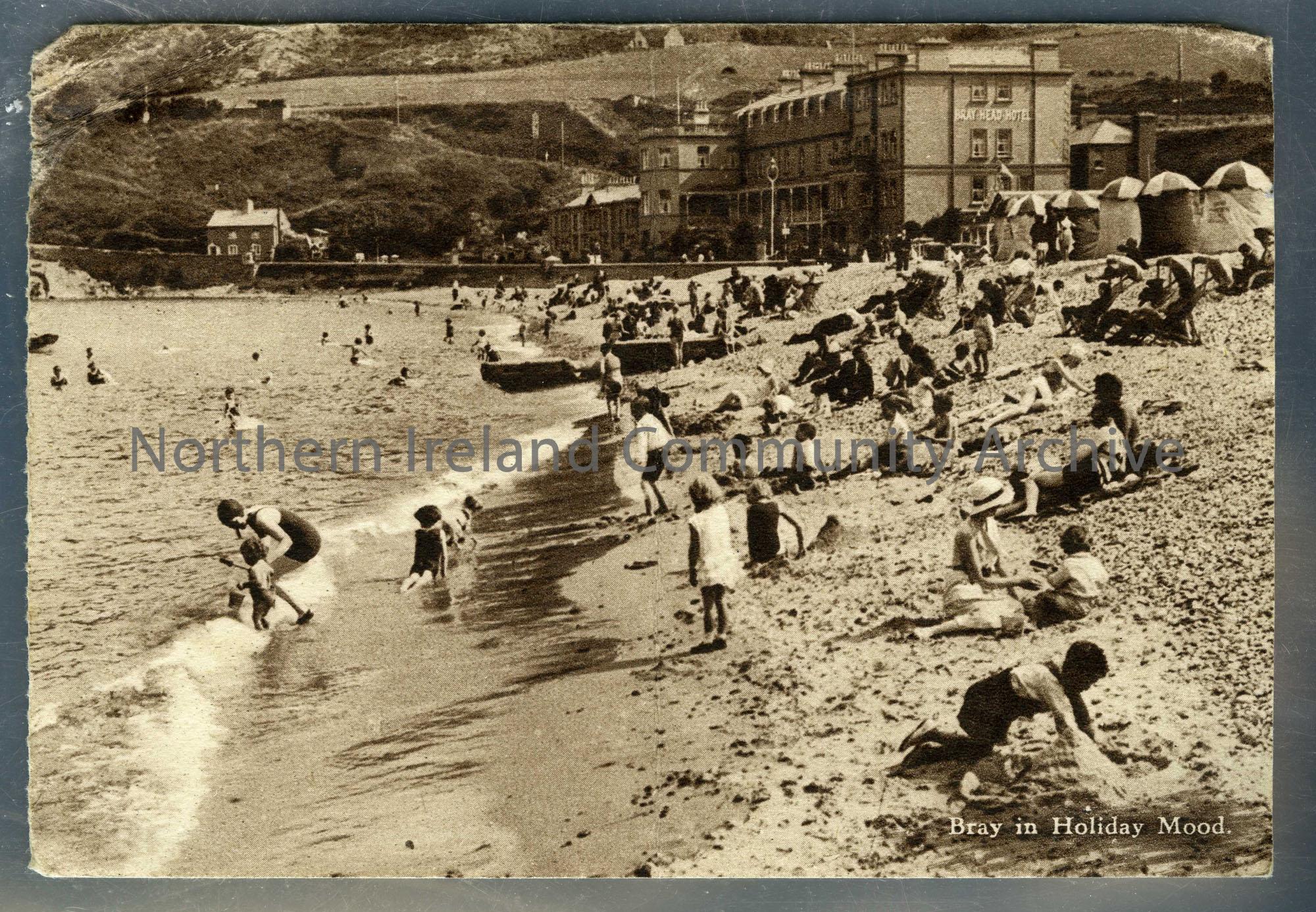 Post card featuring the beach at Bray and Bray Head Hotel. Captioned, ‘Bray in Holiday Mood’. Handwritten to Miss Olive Henry from Dorothy. Writing re…