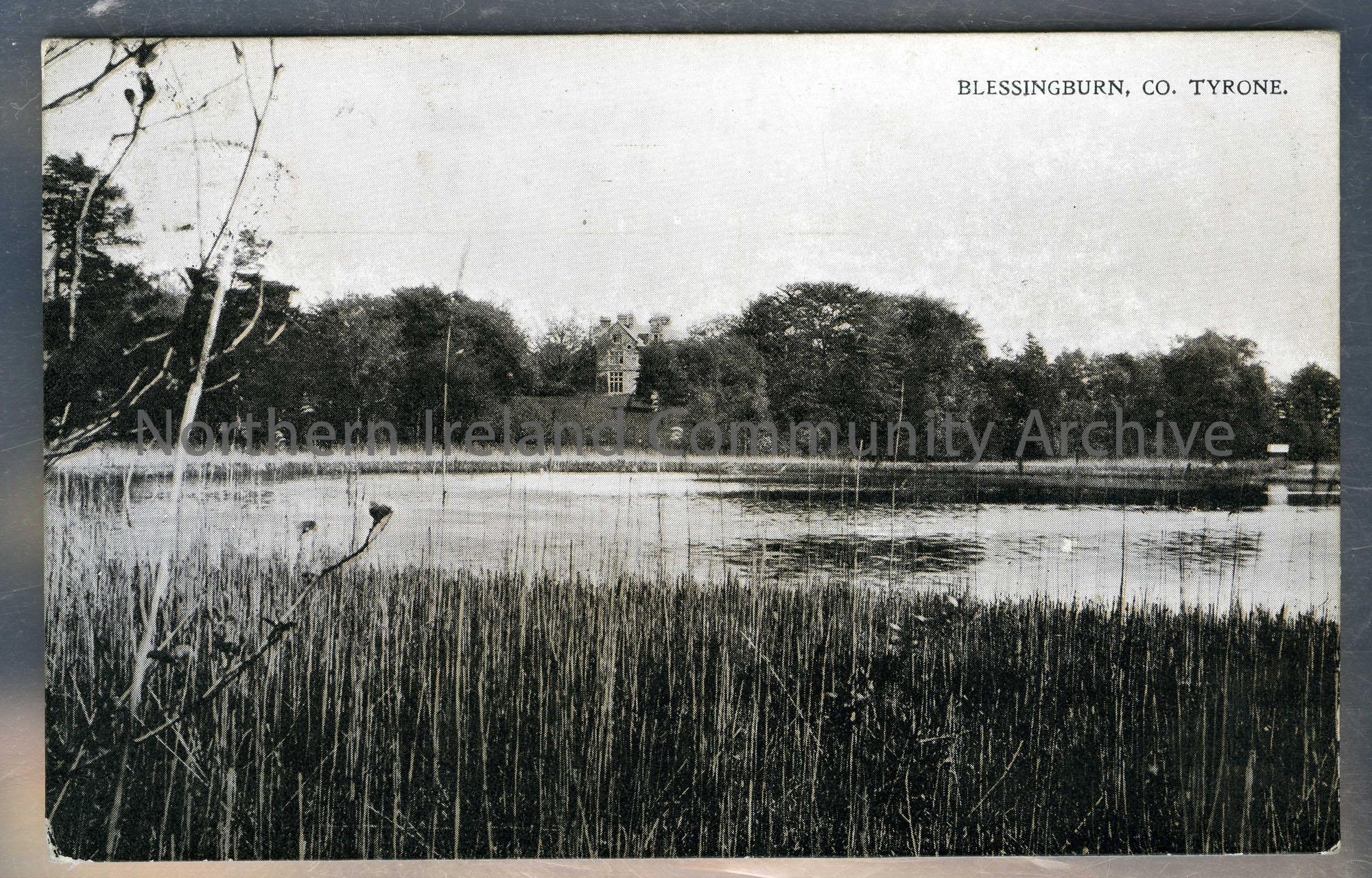 Post card of Blessingburn, Co. Tyrone. Features a large lake and building. Handwritten by Sam Henry to Miss M Henry.