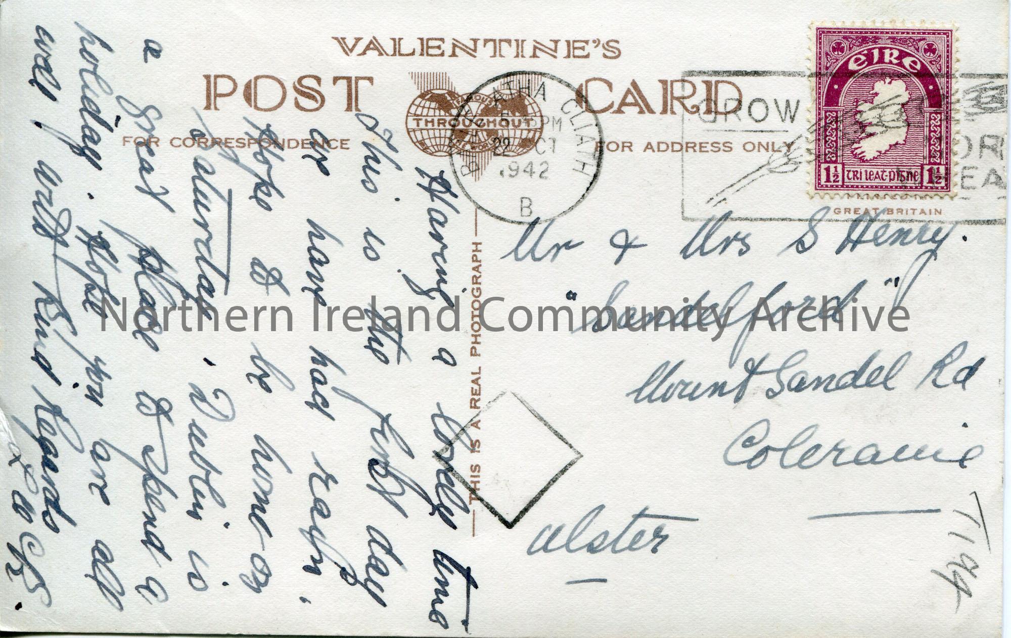 Post card of St. Stephen’s Green, Dublin. Addressed to Mr and Mrs Sam Henry. The writer is currently on holiday in Dublin. – T194c