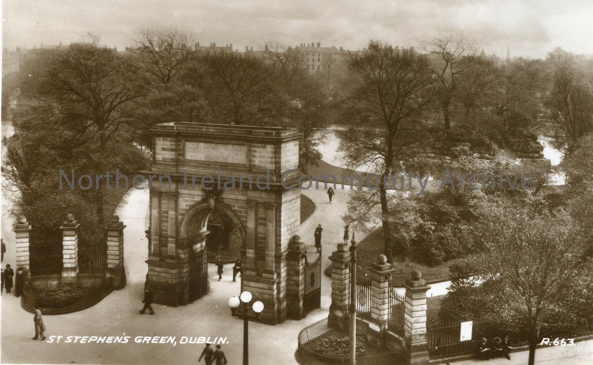 Post card of St. Stephen's Green, Dublin. Addressed to Mr and Mrs Sam Henry. The writer is currently on holiday in Dublin.