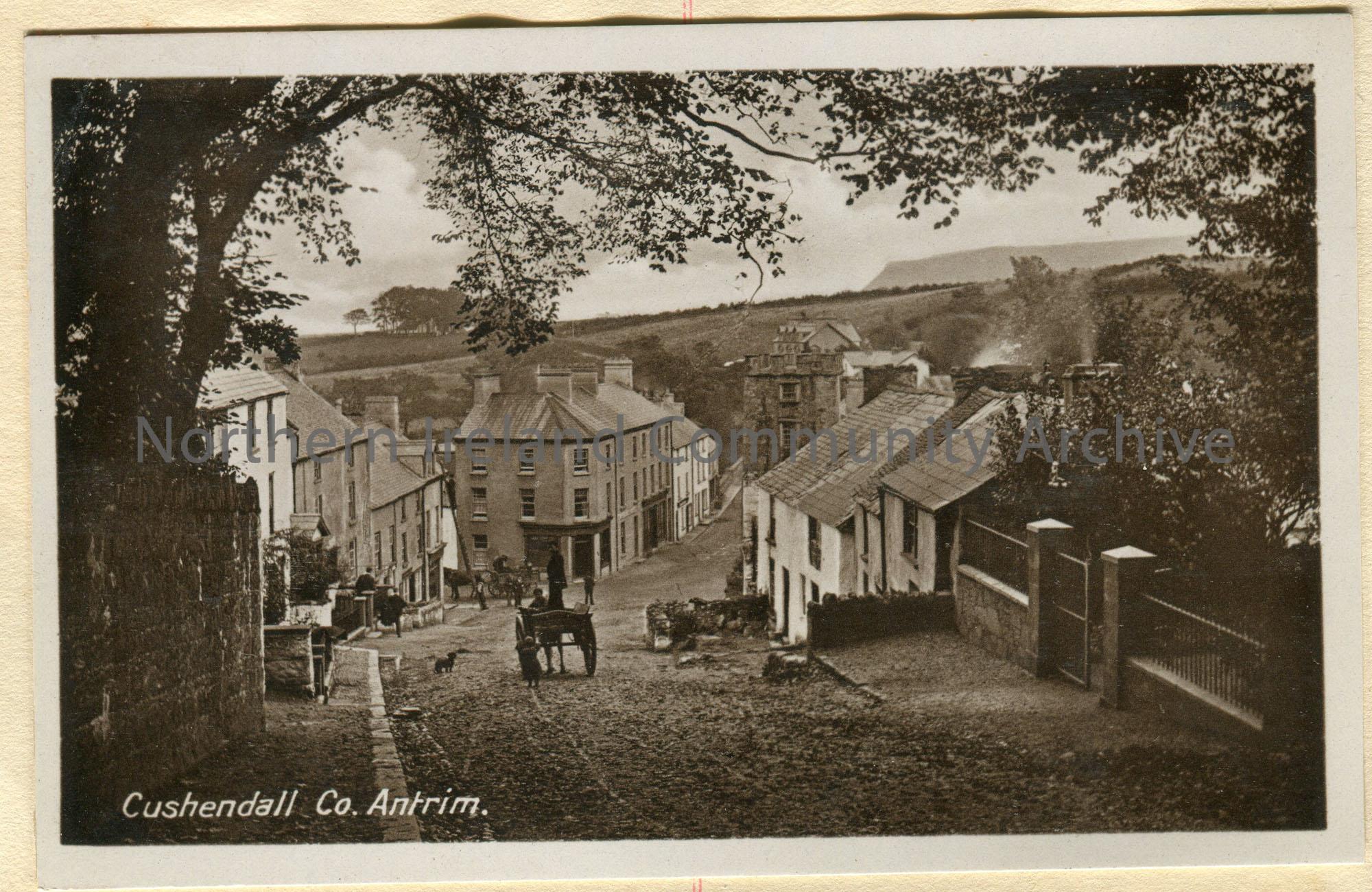 Postcard featuring black and white photographic image of a street scene in Cushendall, Co. Antrim.