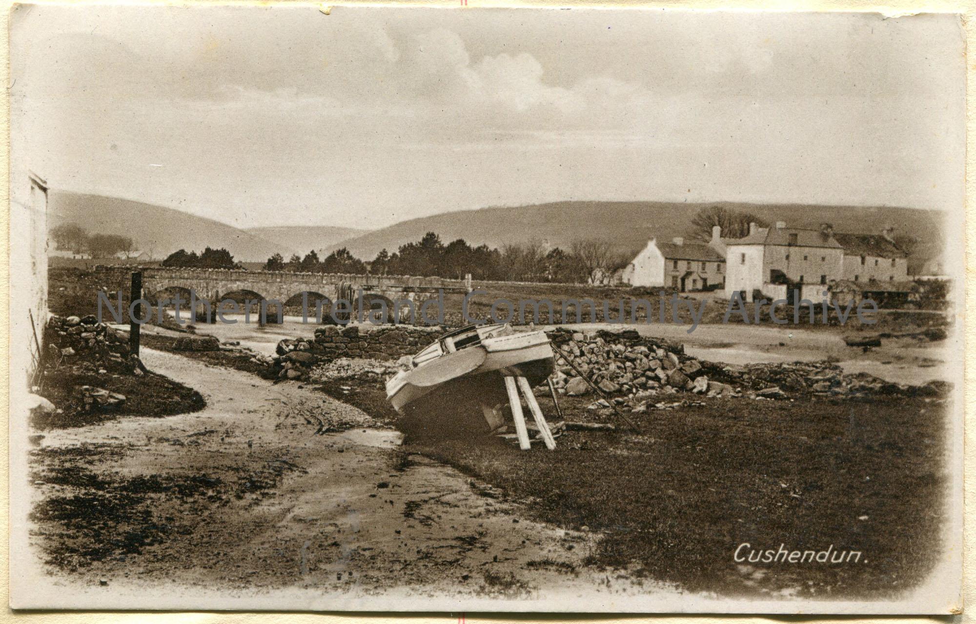 Postcard featuring black and white photographic image of Cushendun. Featuring a river at low tide with a boat in the foreground and bridge in the background.
