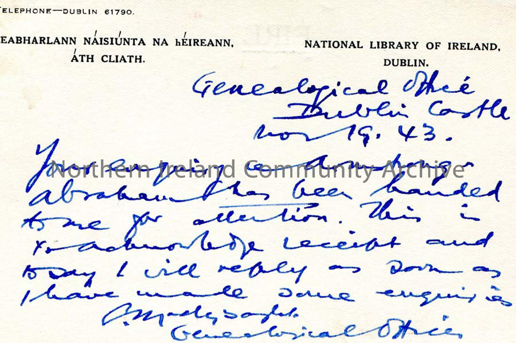 Handwritten postcard to Sam Henry from the Genealogical Office of Dublin Castle. Acknowledging Sam's letter of enquiry re Armstrong - Abraham and will reply when they find out more.
