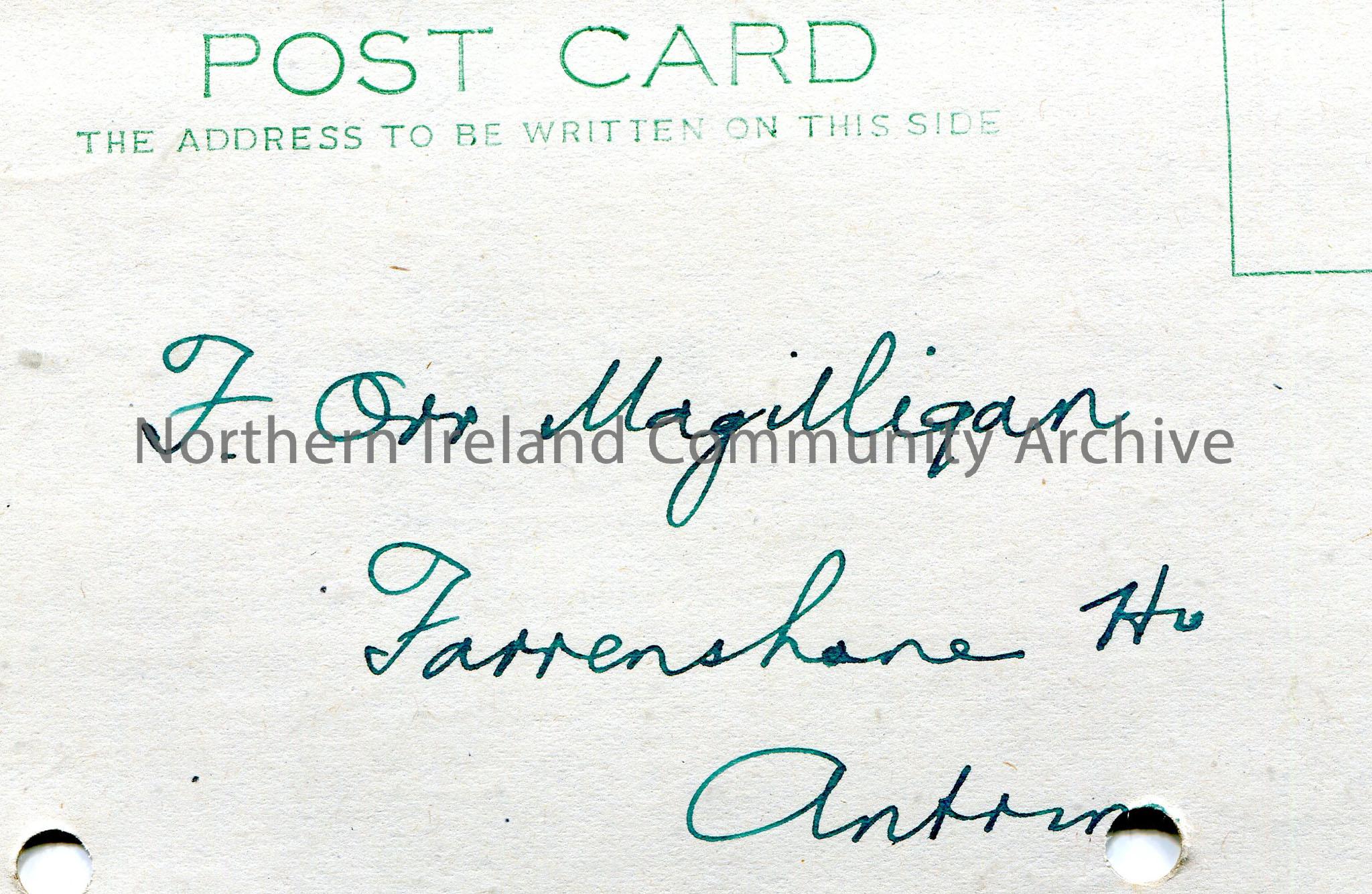 Postcard handwritten in green ink. Addressed but with no stamp to F. Orr Magilligan, Farrenshane House, Antrim. Short note on the Orrs – William Orr a…