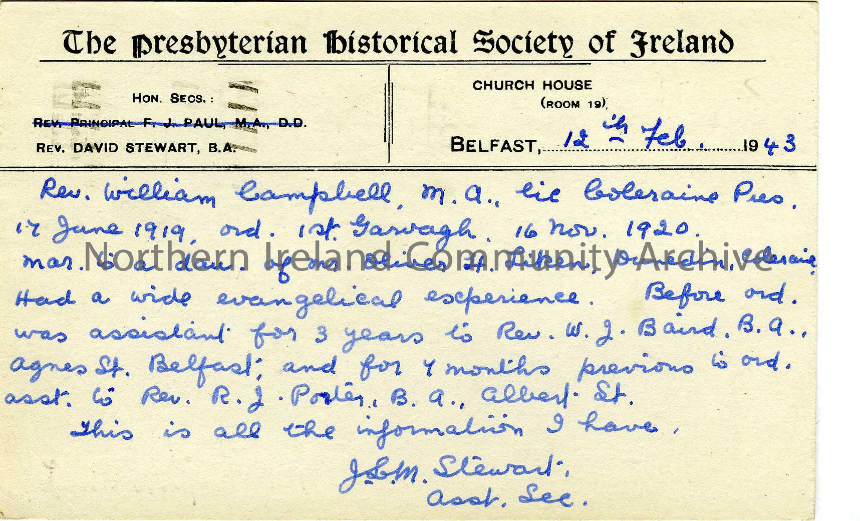 postcard preprinted with The Presbyterian Society of Ireland – handwritten with details of various ministers and posted to Sam Henry