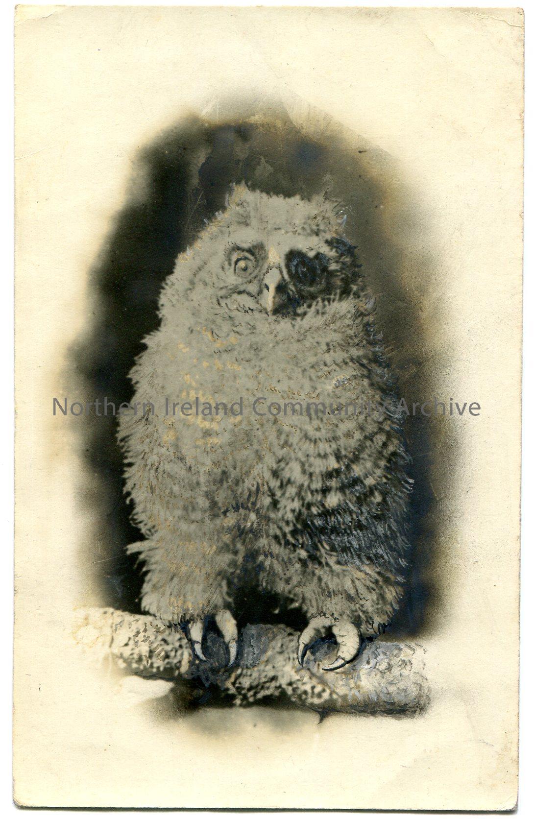 Postcard with an image of a ‘Young Long Eared Owl’ sitting on a branch. ‘S.Henry’ handwritten in pencil on back of postcard. Part of the word ‘owl’ ha…