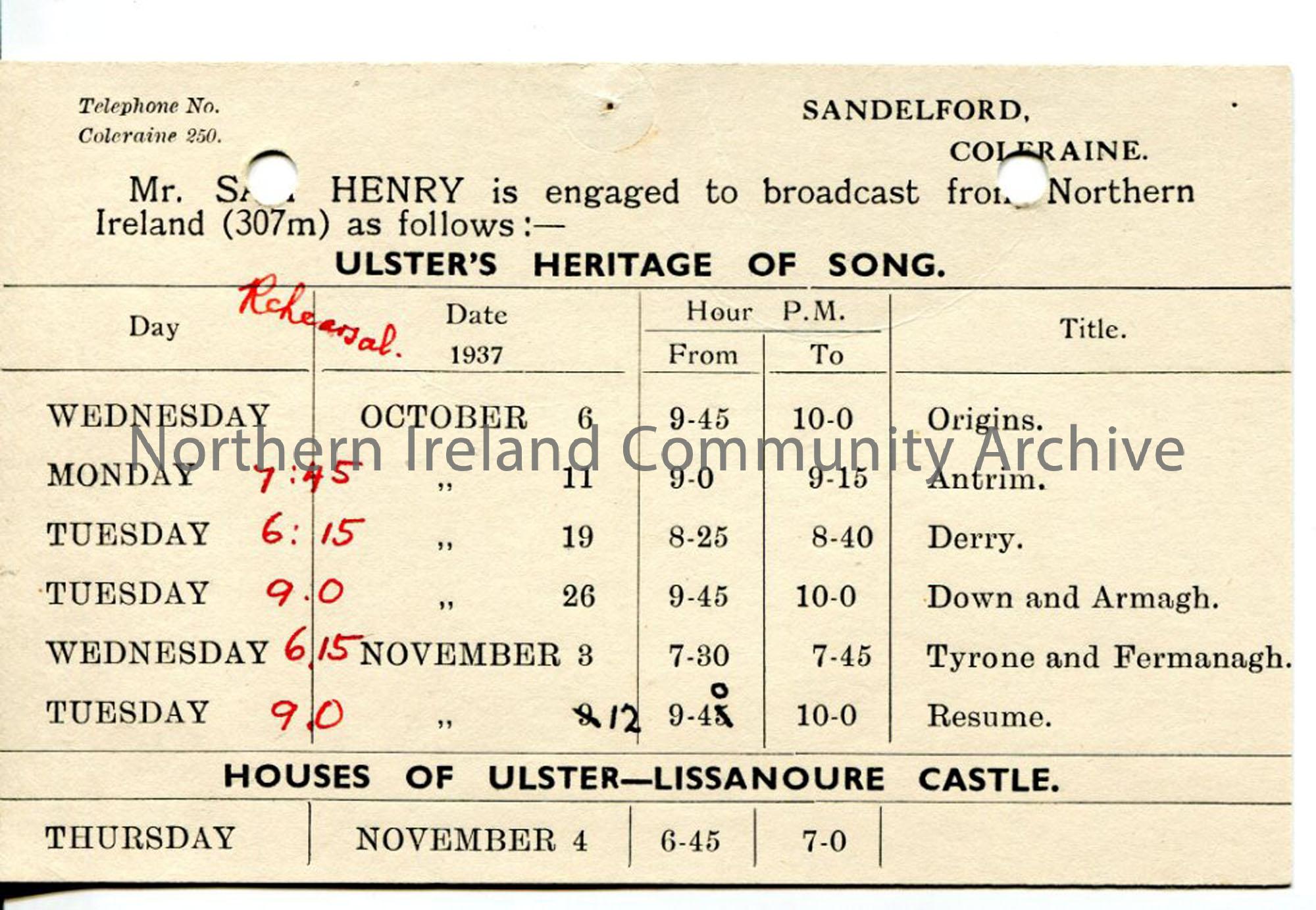 Blank postcard with printed timetable for Sam's engagement to broadcast 'Ulster Heritage of Song' programmes.