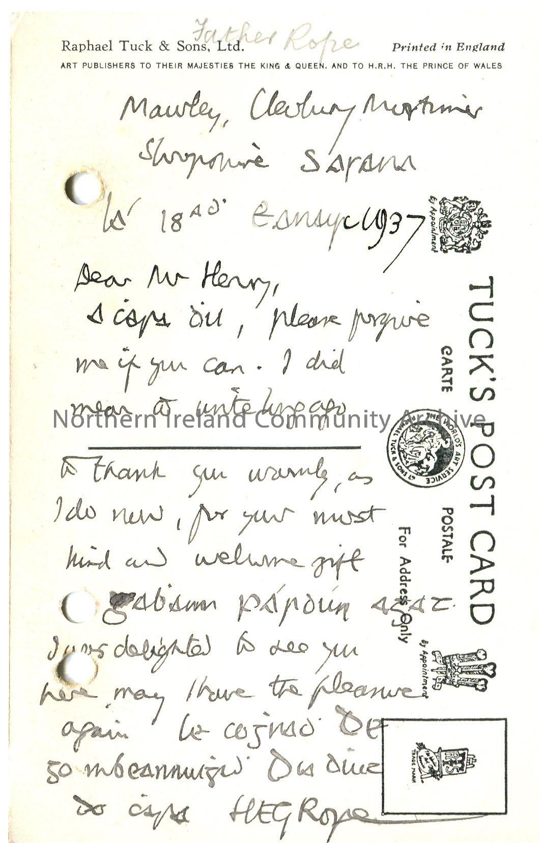 Postcard with image of Mawley Hall in Cleobury Mortimer (Shropshire), with handwritten message on reverse in mixture of English and Gaelic, thanking S… – img045b