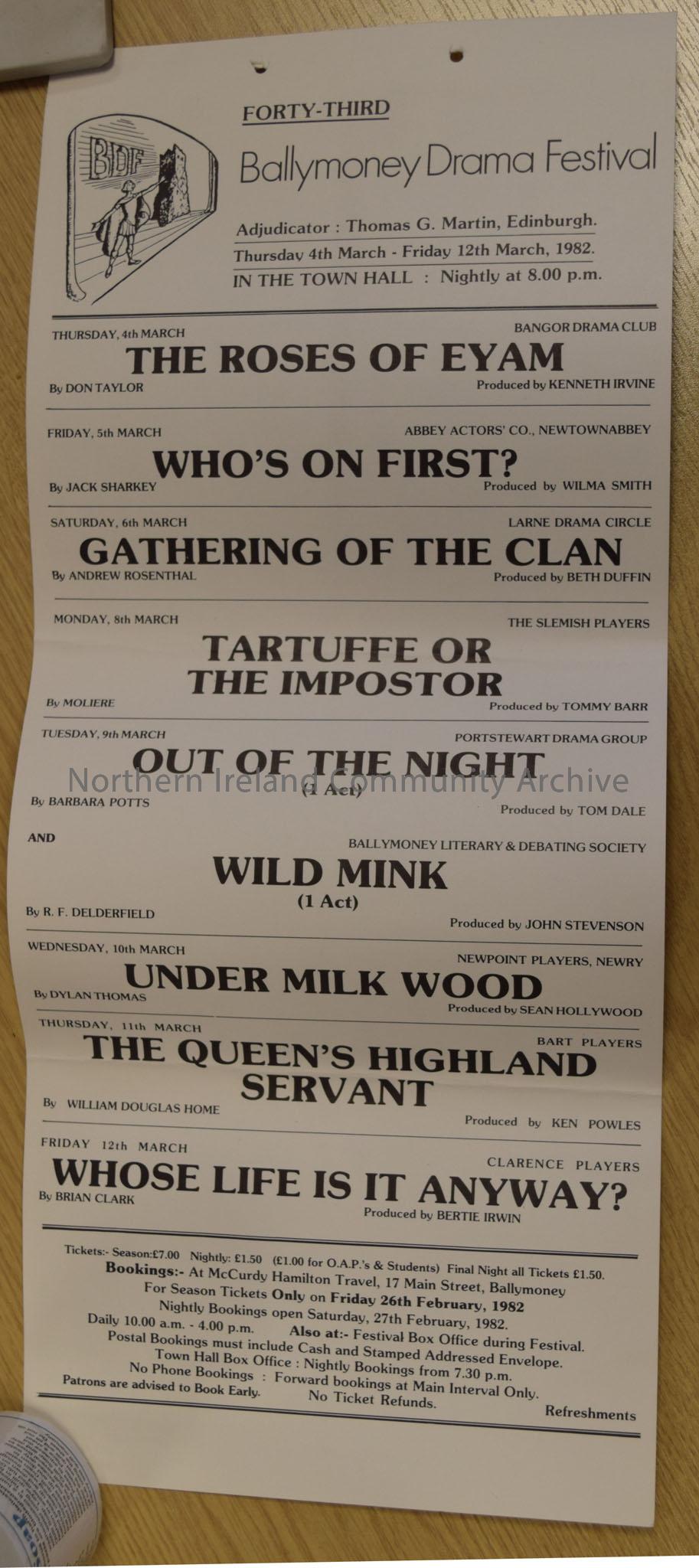 Poster advertising the 43rd Ballymoney Drama Festival in 1982. White cardboard with list of plays in black writing and the Festival logo of a man on a stage with a cloak in front of a tower in the top left.