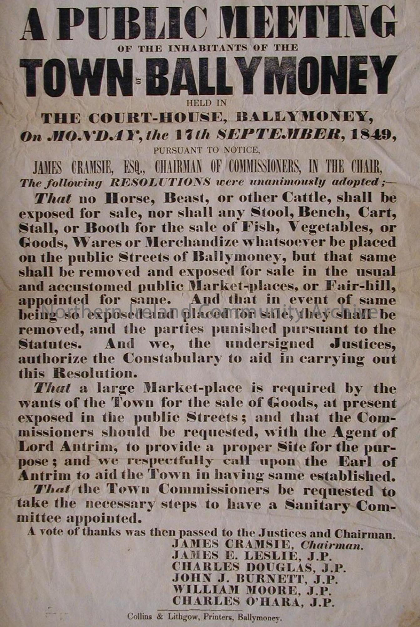 poster banning the sale of livestock or other wares in the street and restricting their sale to the usual market places, and asking Lord Antrim to provide a proper market place.(2 identical copies) Ballymoney 1849