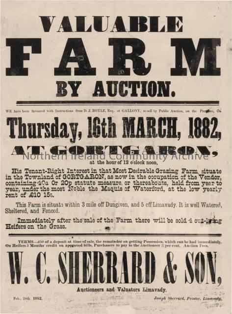 Poster, 'Valuable Farm by Auction. Thursday 16th March 1882, at Gortgaron.'