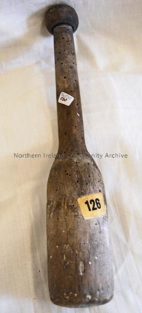 "A wooden instrument used for mashing spuds or making champ. Sometimes a small potato would escape the beetle, and gave rise to the phase, ""juke the beetle"", referring to anyone who neglects to do his duty, or a slippery customer. Courtesy of Ballycastle Museum.