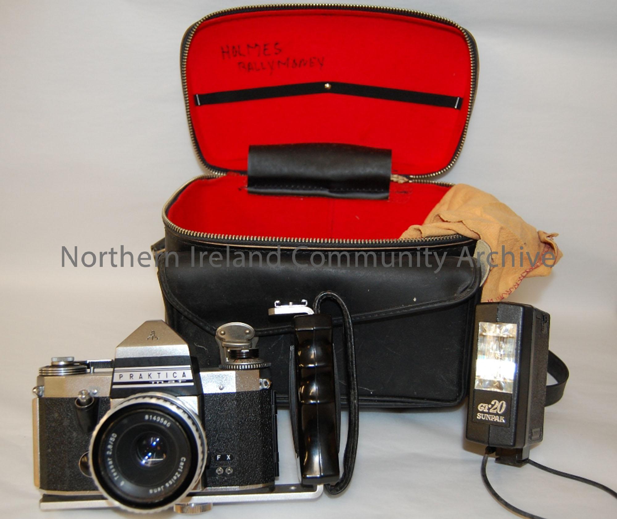 Practika Mat 35mm camera with flash attachment and black zipped bag.