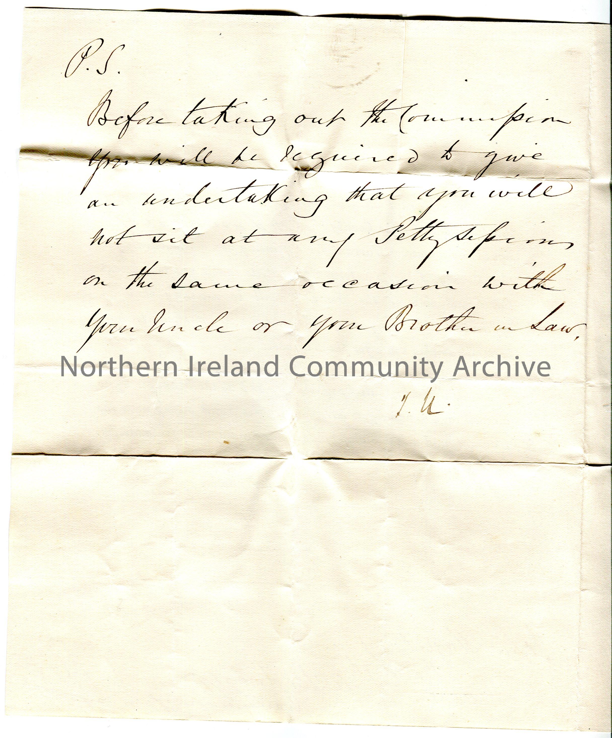 Pre printed letter (folded and written on two sides) with handwritten post script to John Hezlet Esq, Bovagh, Aghadowey, Ballymoney. Informing John Hezlet that he, or someone on his behalf, need to sign a Warrant in order to become Commission of the Peace. Details Stamp Duty fees. Handwritten post script asks for an undertaking that John Hezlet will not sit in any Petty Sessions at the same time as his uncle or brother in law.