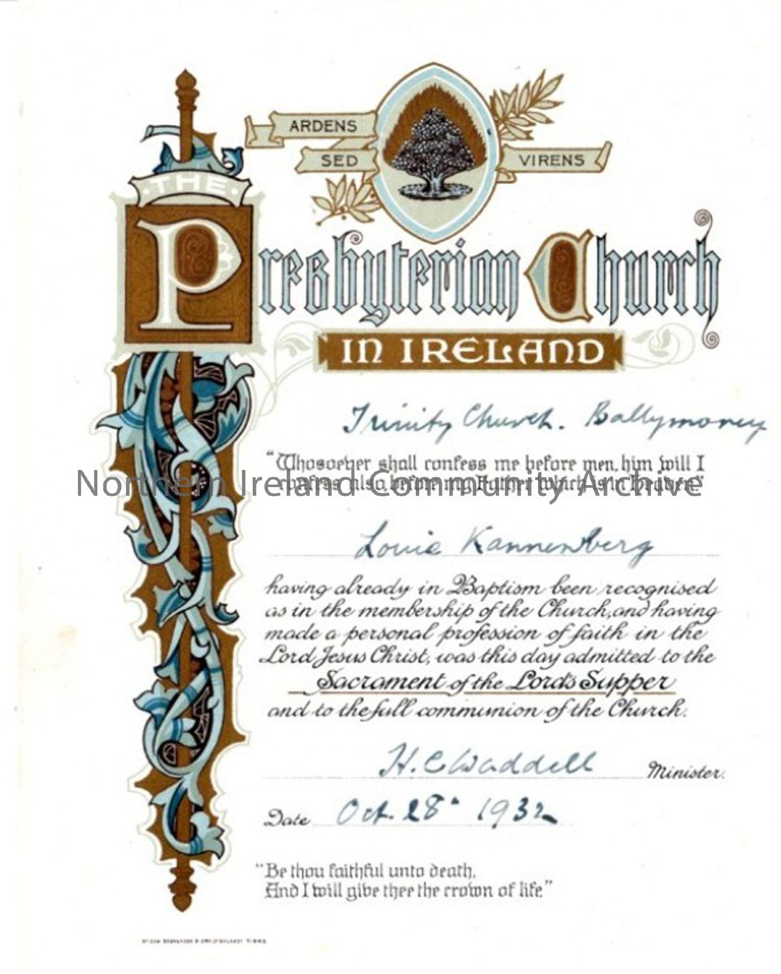 Presbyterian Church in Ireland Trinity Church, Ballymoney certificate of recognition of faith- Louie Kannenberg. Dated October 28th 1932
