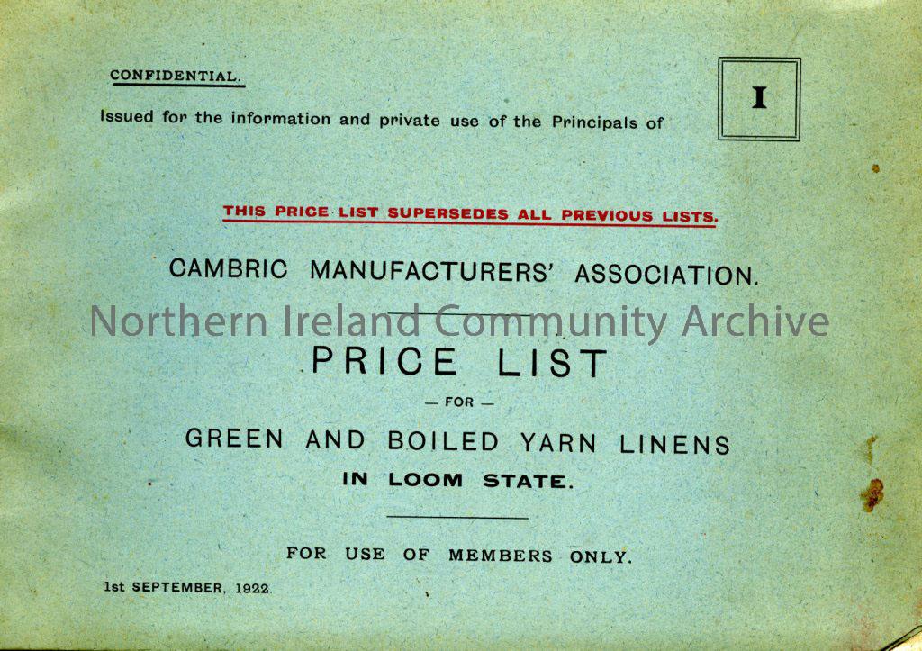 ‘Price list from 1st September 1922 for green and boiled yarn linens in loom state.’