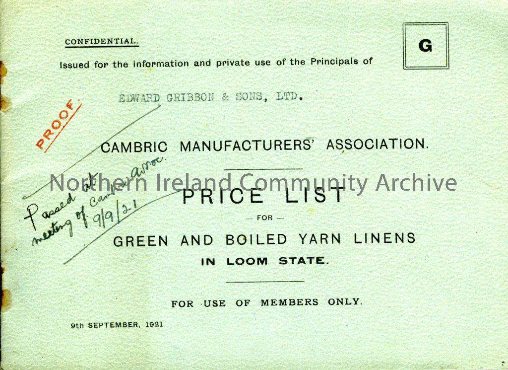 Price list from 9th September 1921 for green and boiled yarn linens in loom state. Handwritten on the front reads ‘Passed at meeting of Cambric Assoc …