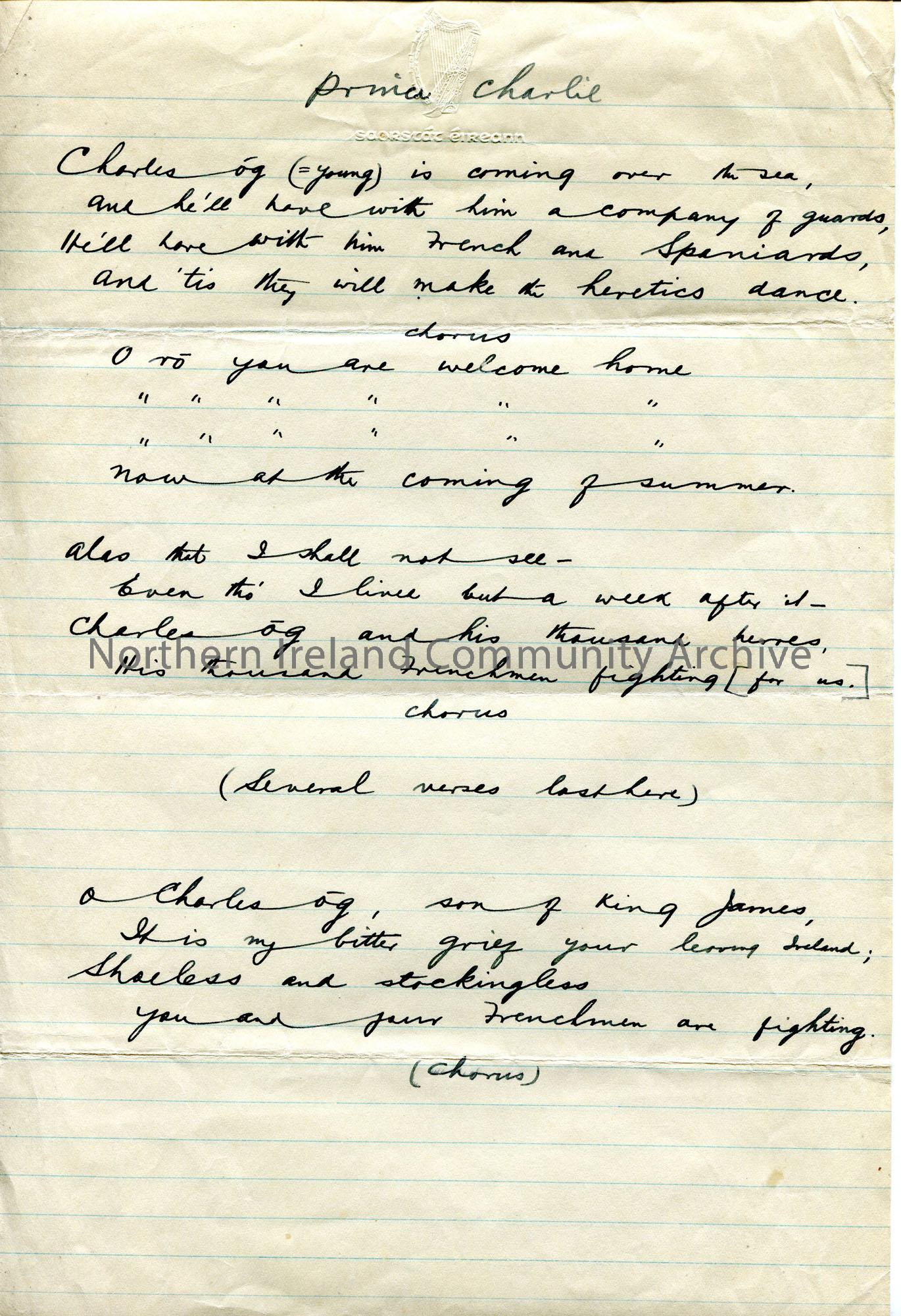 Handwritten words to 'Prince Charlie', about Bonnie Prince Charlie coming with an army of French and Spaniards. Talks of grief at his leaving Ireland - tradition has it that Charles spent some time in Donegal after Culloden, waiting for a French boat to take him to safety.