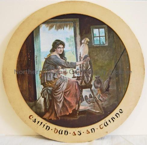 Cailin Dubh ag Tuirne - "Translation of title:"" Dark Girl at the Spinning Wheel"". Print, possibly with added handtouching, in circular Bog Oak frame. Possibly a lithograph. Courtesy of Ballycastle Museum.