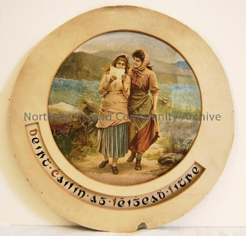 Beirt Cailin ag Leighead Litre - "Title translation: ""Two girls reading a letter"". Print, possibly with added handtouching, in a circular frame of Bog Oak, turned on the lathe in the Irish Home Industries Workshop, Ballycastle. Courtesy of Ballycastle Museum.