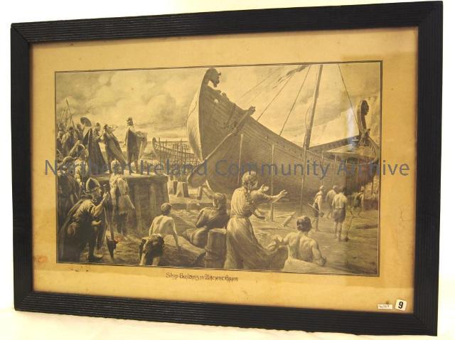 Shipbuilding in Ancient Eirinn B/W.A picture in half-tone illustrating the ancient craft of ship-building. The ship on the stocks is of Viking design with a figure ornamenting the high prow. The picture also gives some insights into costume in ancient Ireland. Courtesy of Ballycastle Museum.