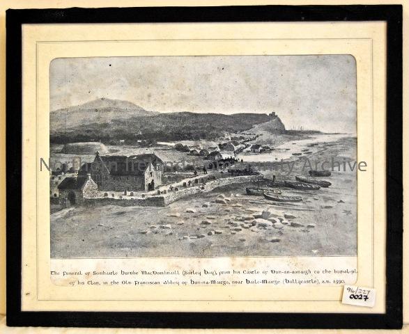 Mounted black and white print of The Burial of Sorley Boy MacDonnell by J W Carey. Courtesy of Ballycastle Museum.