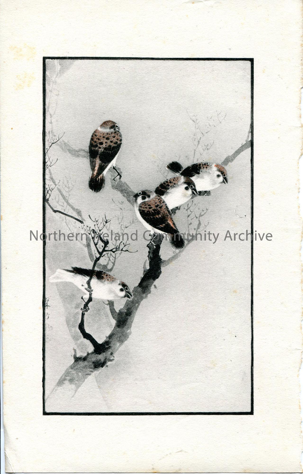 Print of a colour illustration. Features 5 birds with white and brown markings sitting on the branch of a tree. Appears to have been torn from a book …