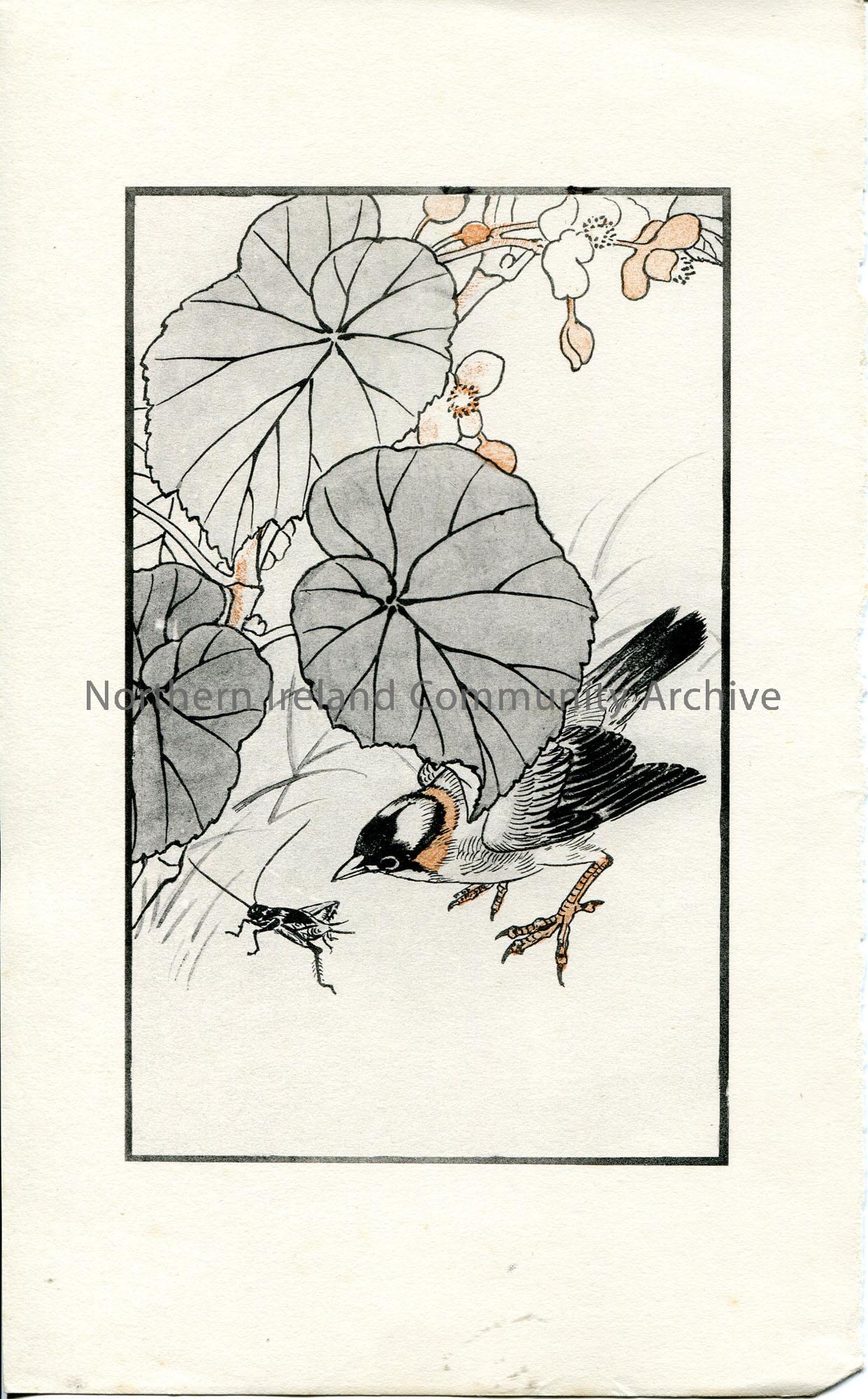 Print of a colour illustration. Features a bird looking at a grasshopper. Appears to have been torn from a book of some sort.