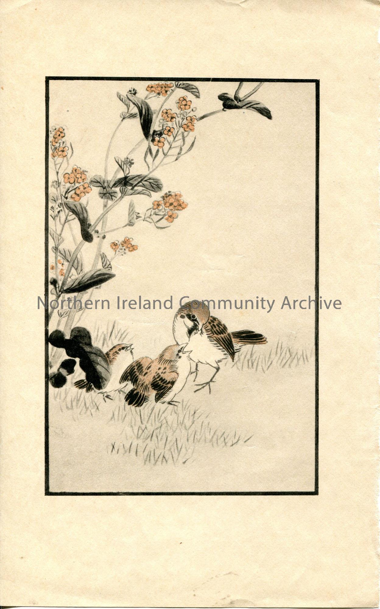Print of a colour illustration. Features an adult bird with its chicks. Appears to have been torn from a book of some sort.