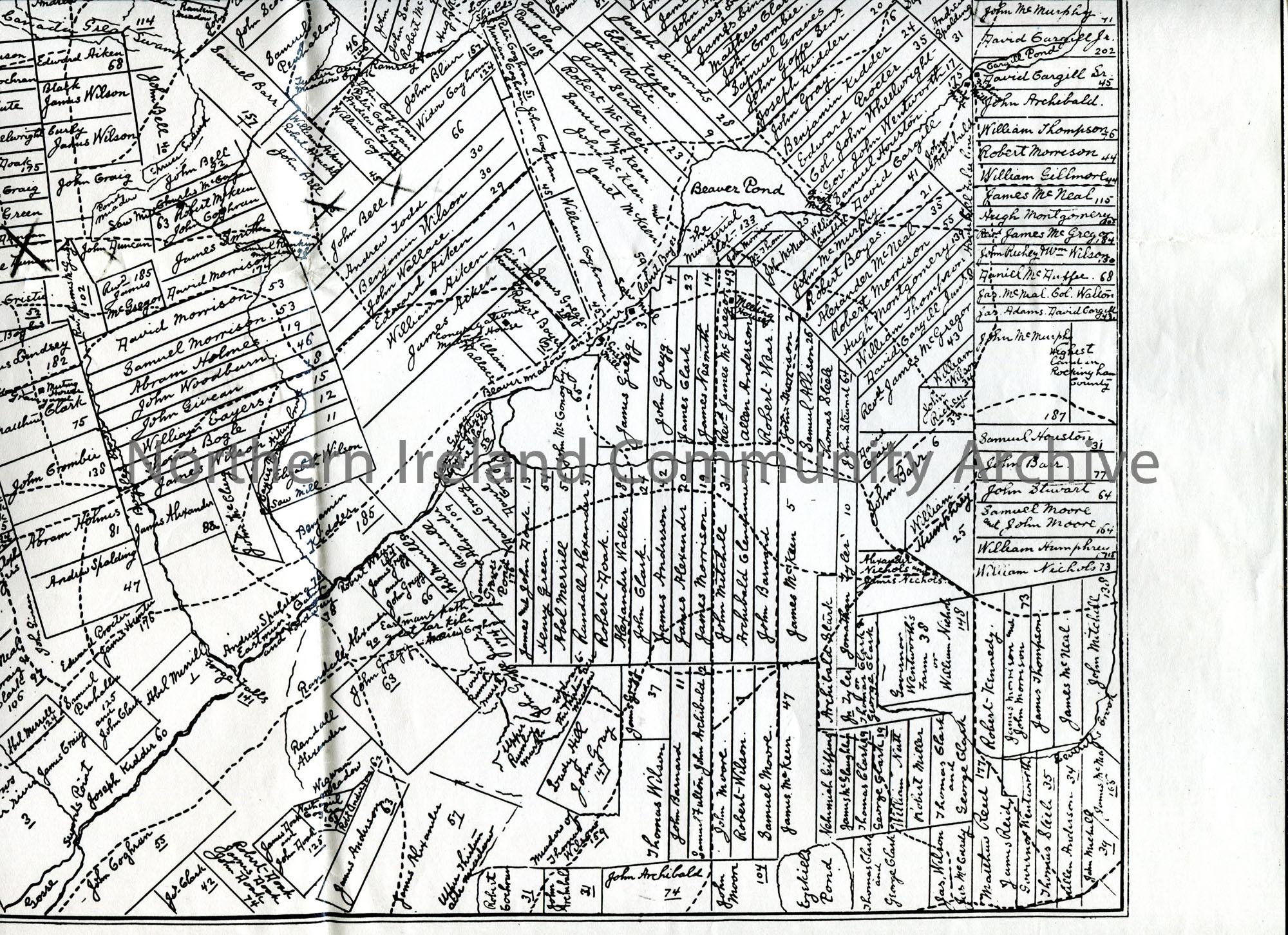 Print of a map (black and white colour). Note at top left reads, 'Map of a large portion of the original town of Nutfield settled in 1719 and chartered as Londonderry in 1722, prepared and drawn by Revd J. G. McMurphy. All rights reserved'. Contains the names of those living on the land. 'X' marked on map at names John Bell and John and George Duncan.