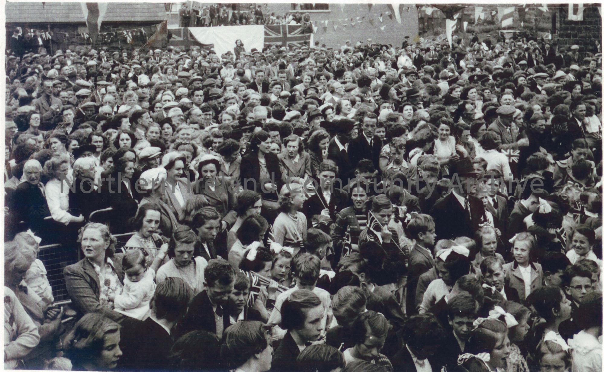 Print of a photograph of large crowd gathered at Ballymoney Railway Station to greet the Queen as she stopped here on her coronation tour on 3rd July 1953