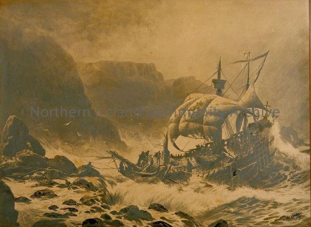 The Wreck of the Girona - wrecked at Port Na Spaniagh, 1588. This picture was painted for the Belfast Art Society's Exhibition in 1895 and differs slightly from a painting of Carey's which appears in the Ulster Journal of Archaeology Vol 1, 1895 pg 190.This artifact appears to be a photographic copy touched up in ink, not an actual painting. Courtesy of Ballycastle Museum.