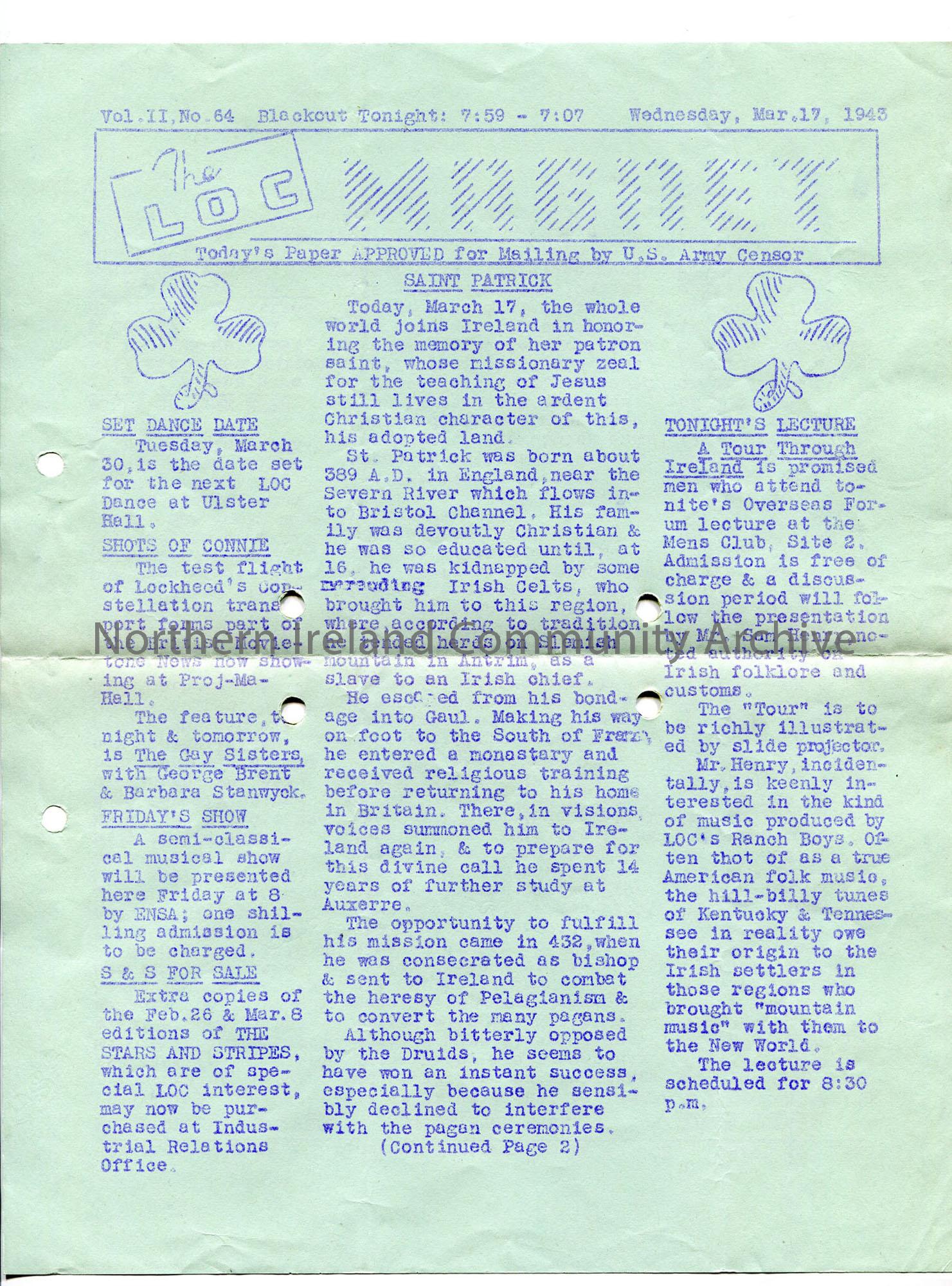 Printed 1-page news sheet - 'The LOC Magnet' - Vol II. No 64 - gives blackout times, show dates and times, St Patrick, lecture by Sam Henry in Men's Club, deaths and other news for Ireland - American publication ('approved for mailing by US Army censor').