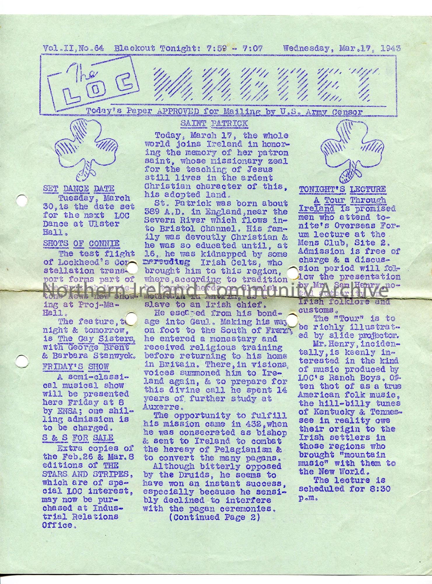 Printed 1-page news sheet - 'The LOC Magnet' - Vol II. No 64 - gives blackout times, show dates and times, St Patrick, lecture by Sam Henry in Men's Club, deaths and other news for Ireland - American publication ('approved for mailing by US Army censor').