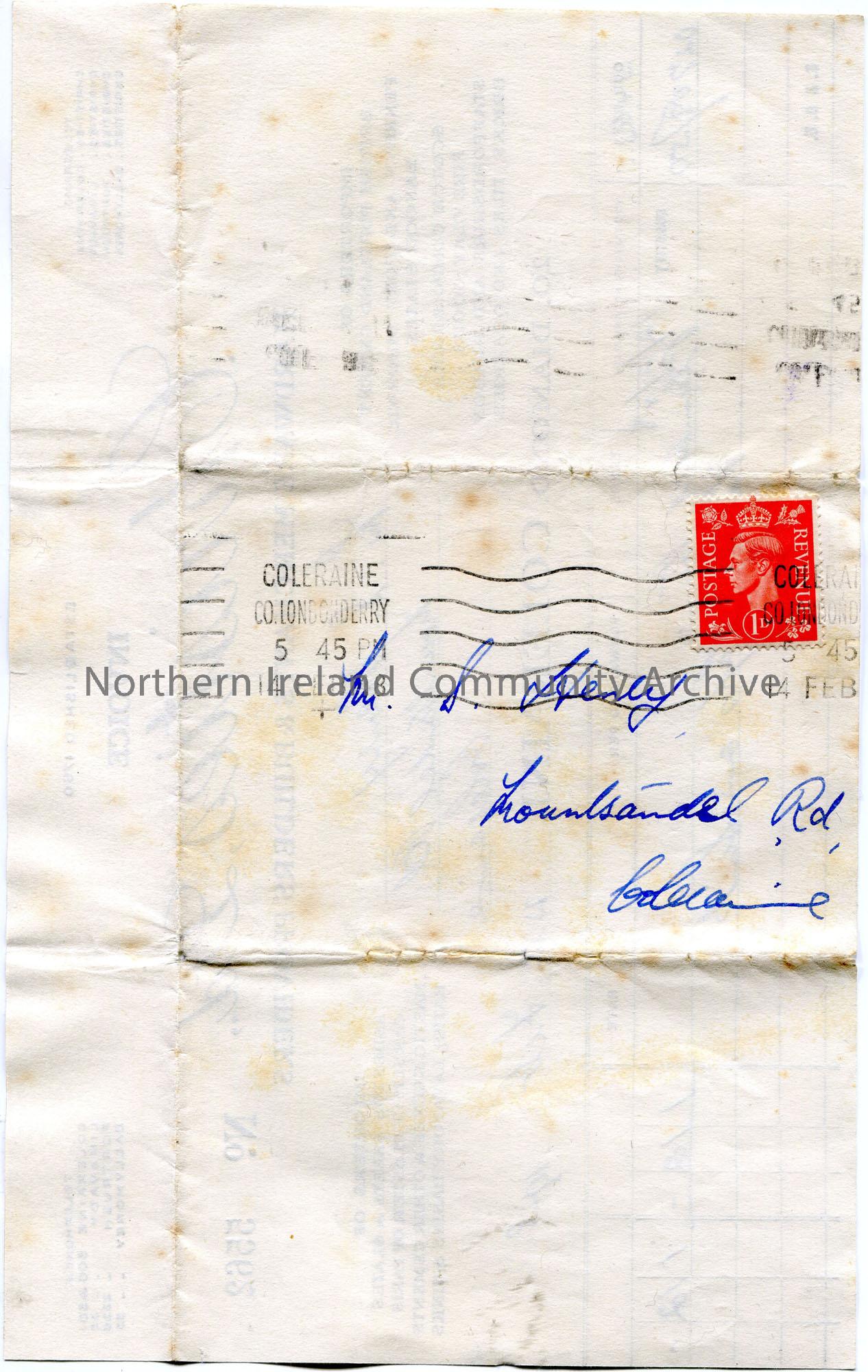 Printed and handwritten invoice to Sam Henry from Christies, Ltd., for plumbers time and fitting of taps on a sink. Total sum of 1. 12. -. Dated 13th February 1948. Sam Henry's Mountsandel address and red 1D King George VI postage stamp on reverse.