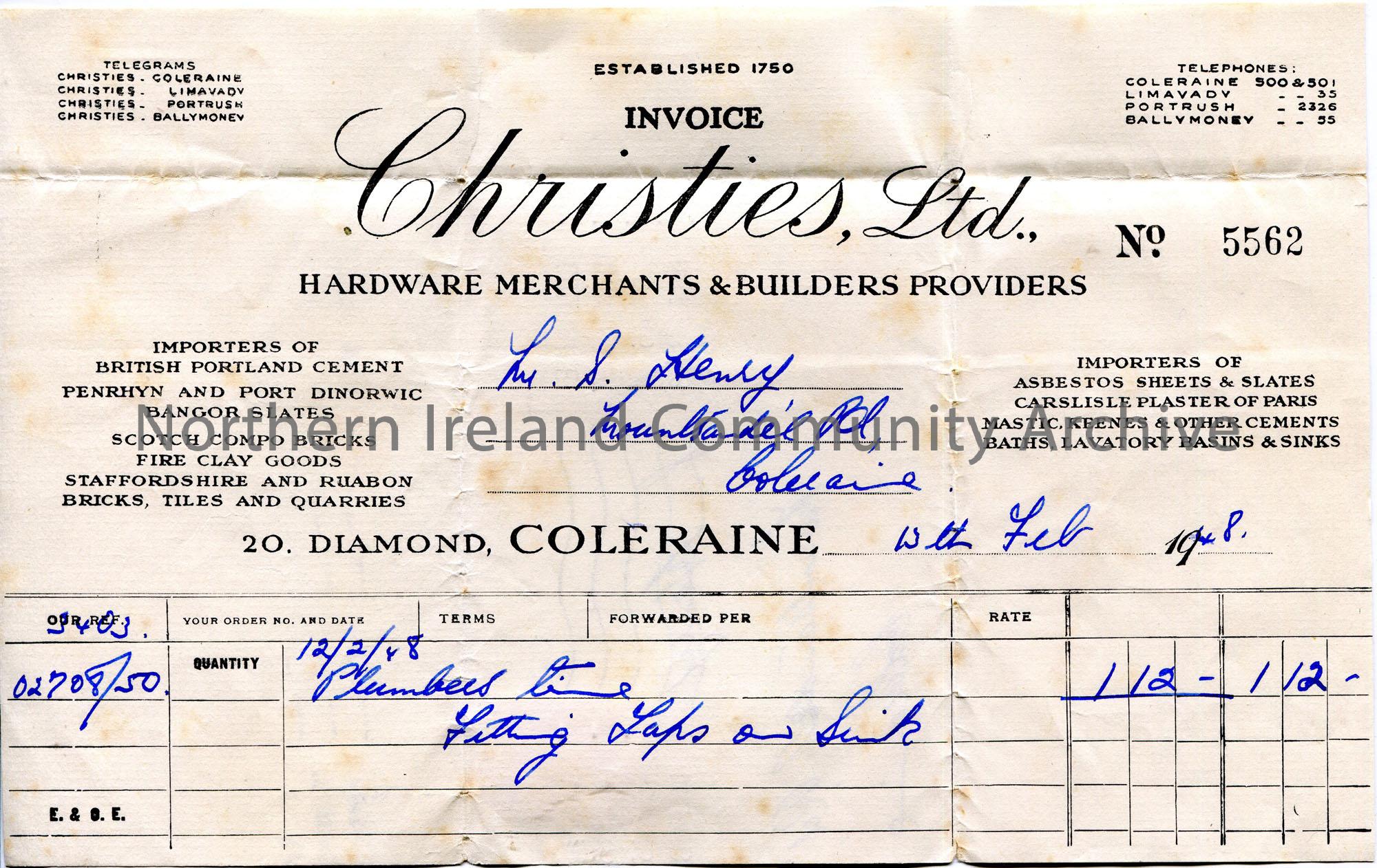 Printed and handwritten invoice to Sam Henry from Christies, Ltd., for plumbers time and fitting of taps on a sink. Total sum of 1. 12. -. Dated 13th February 1948. Sam Henry's Mountsandel address and red 1D King George VI postage stamp on reverse.