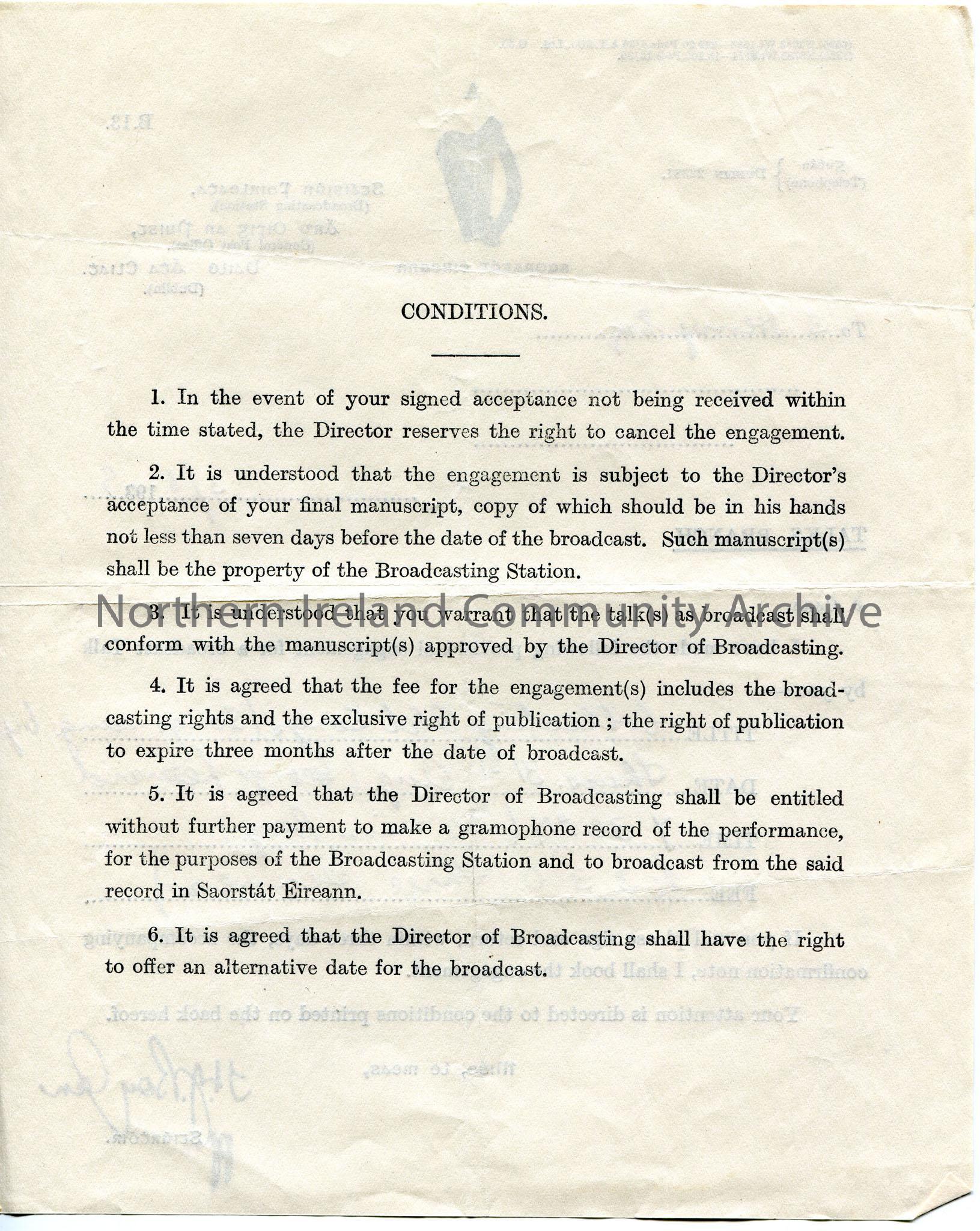 Printed and handwritten letter on headed paper to Sam Henry. Proposal of a broadcast Talk 'Collecting Old Songs (songs sung by George Leonard)' on 31st August, 1939. Sam to sign and return note that accompanied letter. Conditions on back of page.