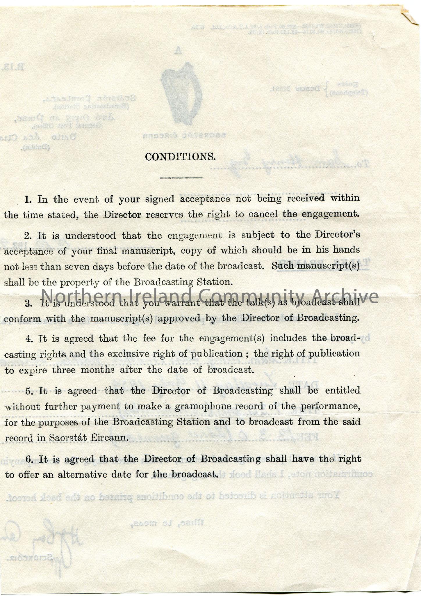 Printed and handwritten letter on headed paper to Sam Henry. Proposal of a broadcast Talk 'Sam Henry Tells Another Rathlin Island Story' on 11th July 1939. Sam to sign and return note that accompanied letter. Conditions on back of page.